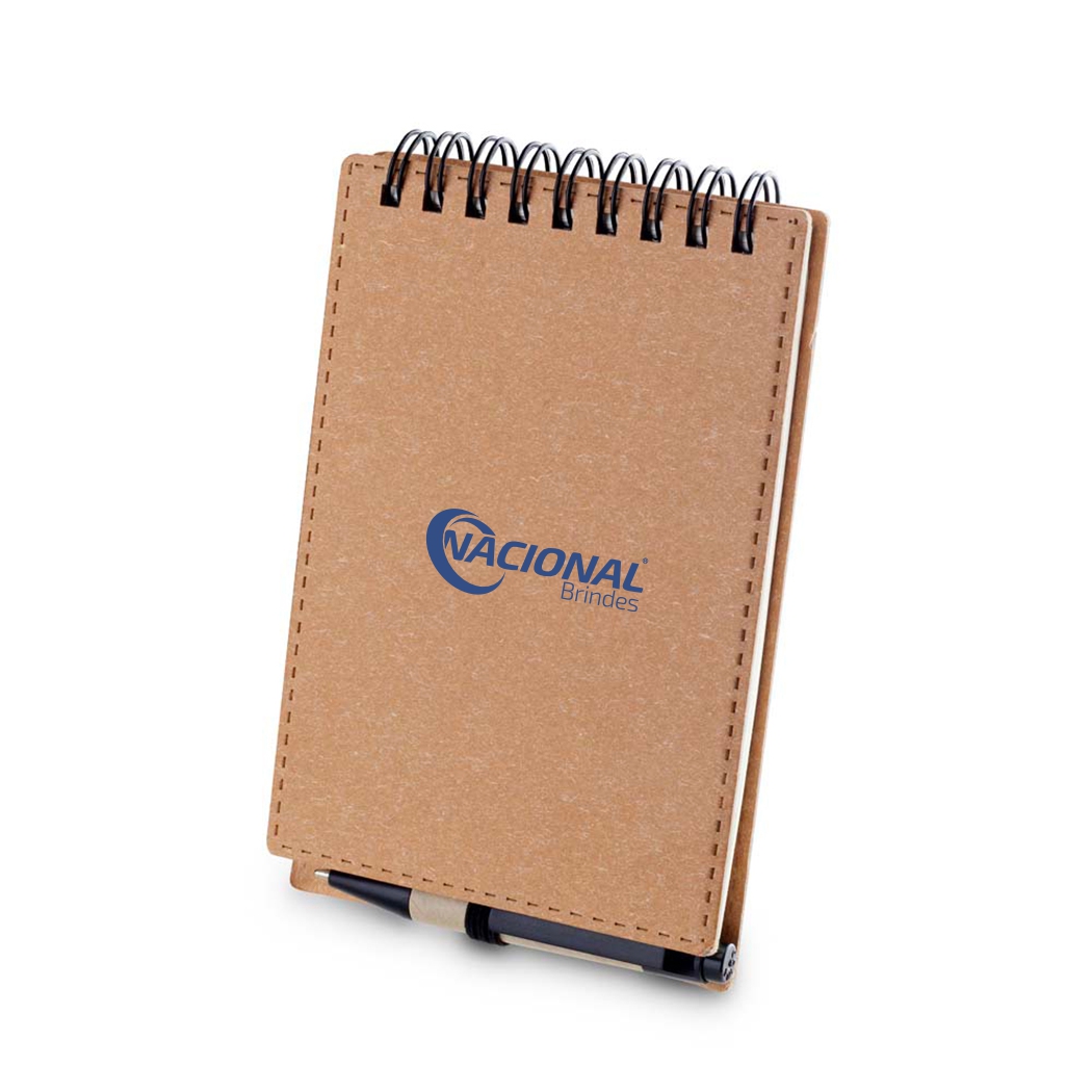 Bloco de anotação pequeno com mini caneta. O bloco é fabricado em capa de papelão, folhas em 70g/m² e wire-o. A caneta é produzida em papelão reciclado e detalhes em plástico.