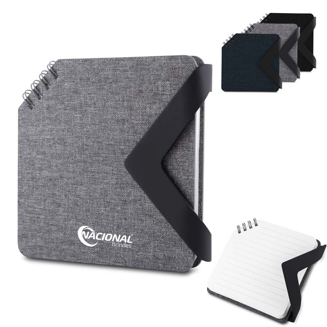 Bloco de anotações com design inovador. Possui capa em RPET, miolo na cor bege com 70 folhas pautadas em papel 100g/m² e fecho magnético em PU.