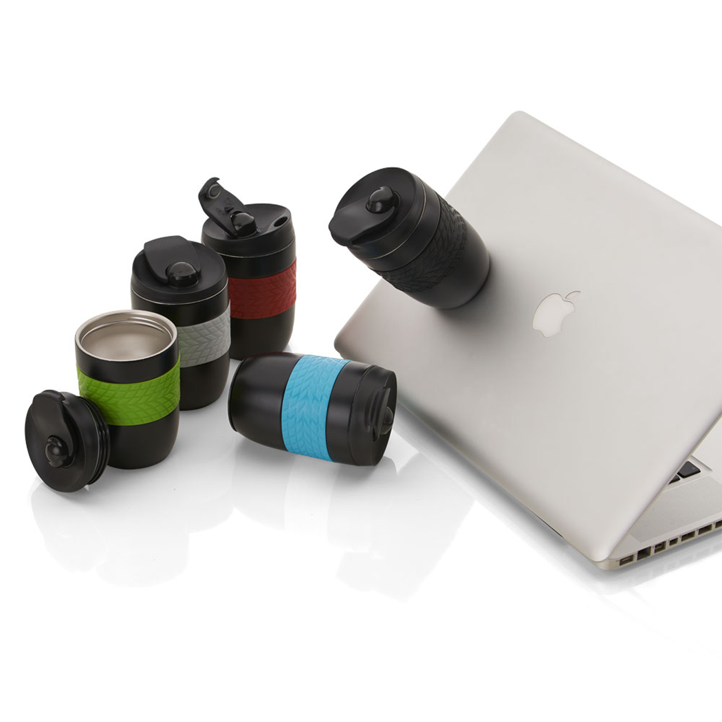 Caneca inox antiqueda com parede dupla, conserva temperatura, pegador em silicone e bico com tampa. Capacidade 260ml.