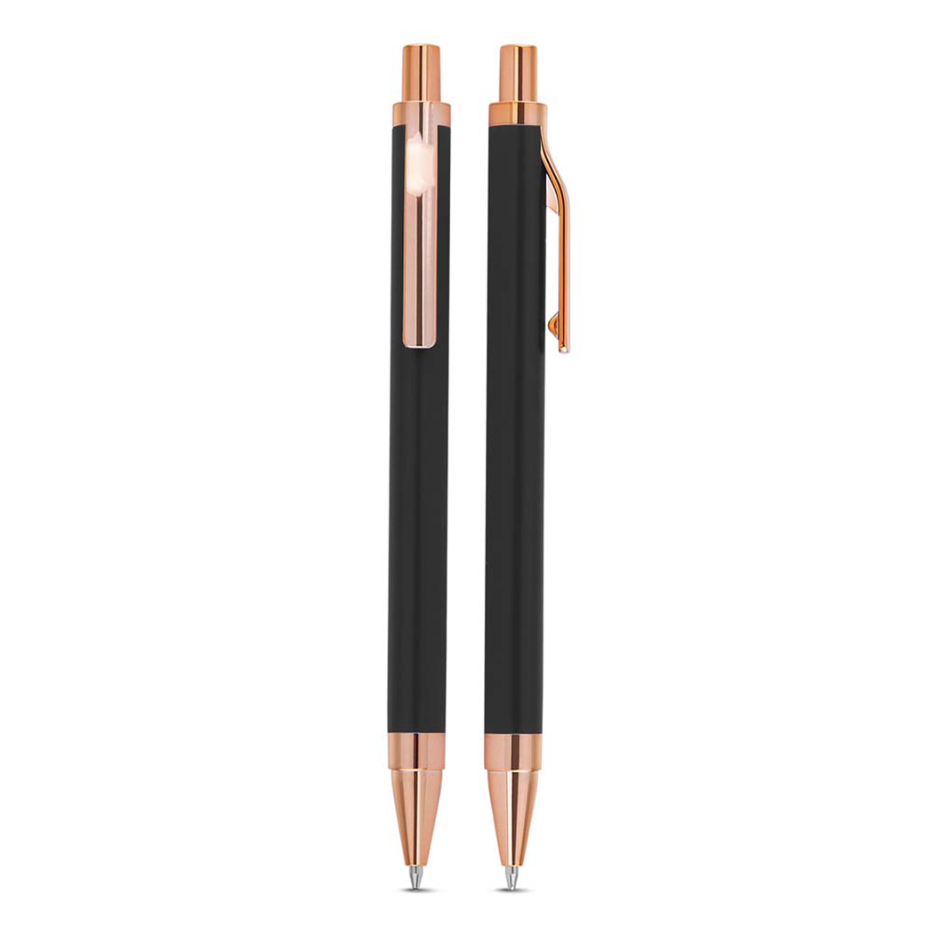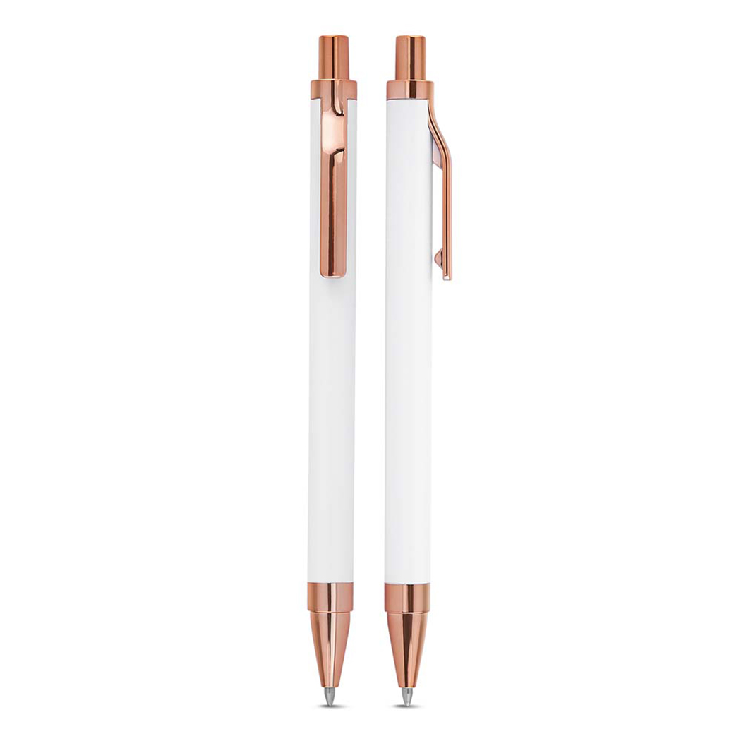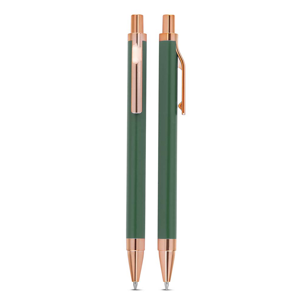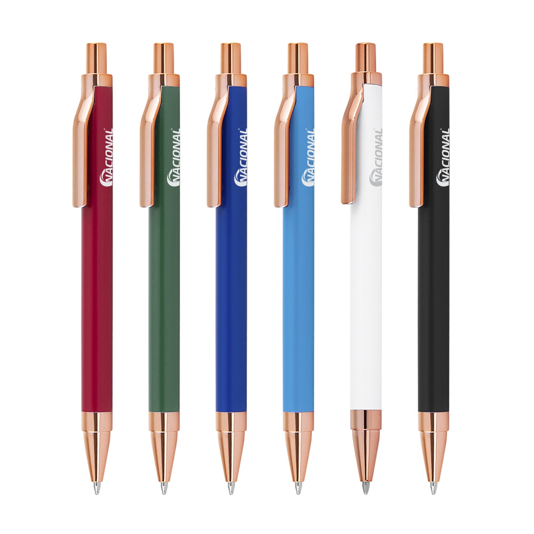 Caneta de alumínio reciclado com detalhe em bronze. Possui o corpo colorido e clip, acionador e ponteira em bronze. Conta com estilo de escrita esferográfica.