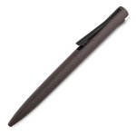 Caneta de metal com acionador diferenciado. Clip metal preto. Aciona por clique na lateral. Escrita em azul.