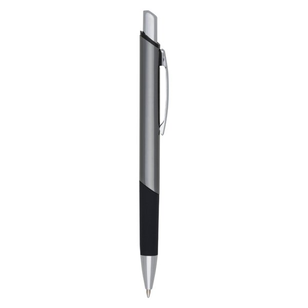 Caneta de metal quadrangular. Possui corpo colorido com pintura brilhante metalizada e detalhe emborracha preto na parte inferior. Aciona por clique.