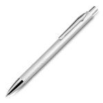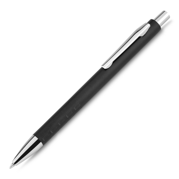 Caneta metal com detalhe quadriculado no corpo. Possui a escrita em azul.