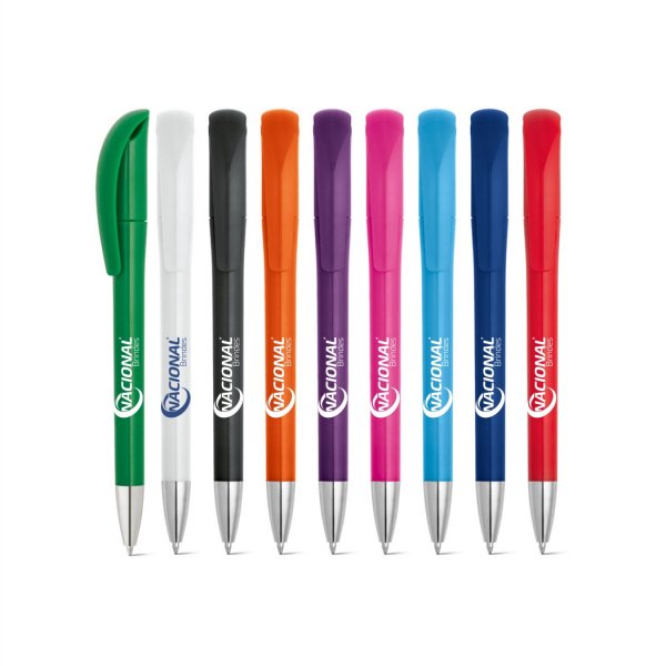 Caneta plástica brilhante colorida, com clip grande e curvado. Possui ponteira cromada.