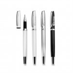 Caneta roller com detalhe prateado. Possui anel central prateado e escrita em azul. Ideal para quem busca sofisticação.