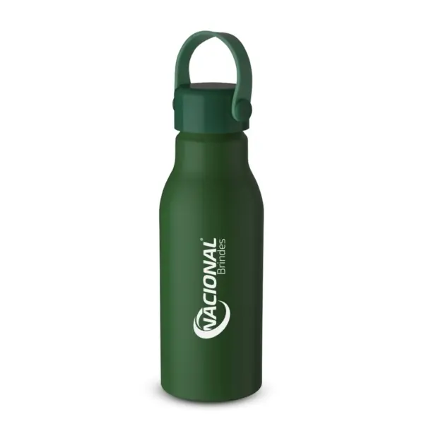 Garrafa de alumínio com alça na cor do produto. A tampa e a alça são fabricadas em plástico. Possui pintura fosca e capacidade de 550ml.