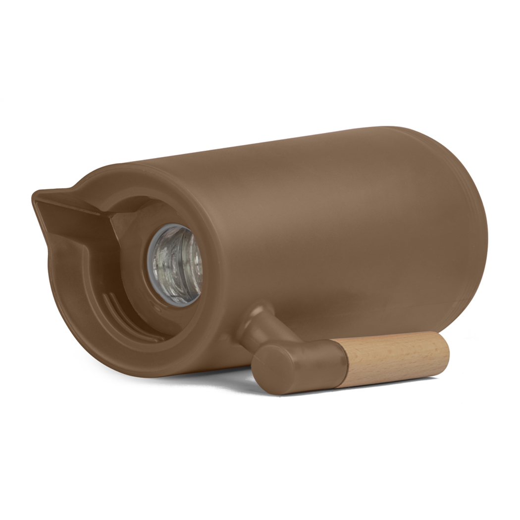 Garrafa térmica com alça de madeira. Fabricada em plástico PP na parte externa da peça. Possui parede dupla com ampola de vidro, sistema corta pingo, tampa rosqueável com anel de silicone e capacidade de 1 litro.