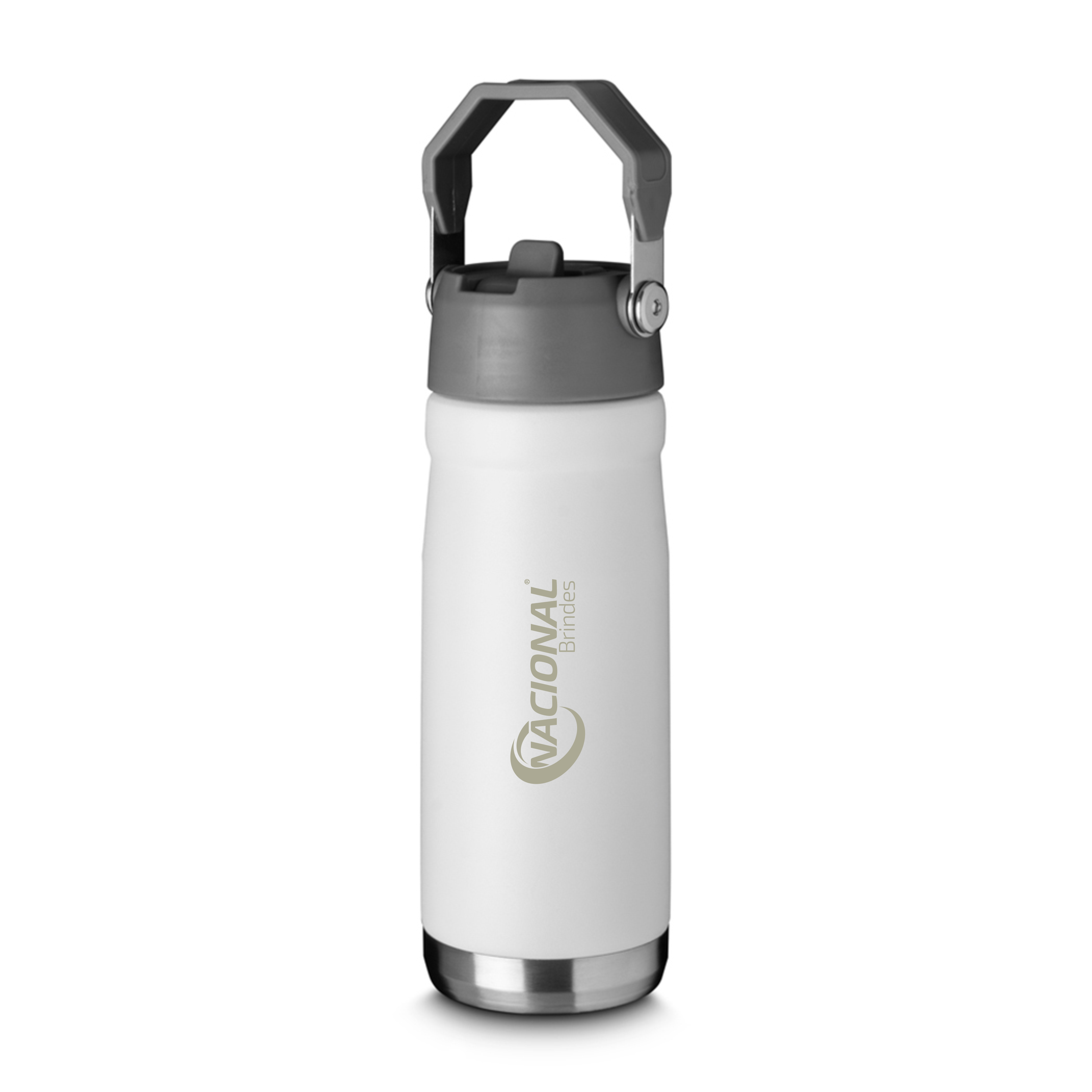 Garrafa térmica com alça detalhada. Fabricada em aço inox, com parede dupla. Possui tampa e alça de transporte em plástico. Vem com bico por meio de sucção juntamente com canudo. Sua capacidade é de 700ml.