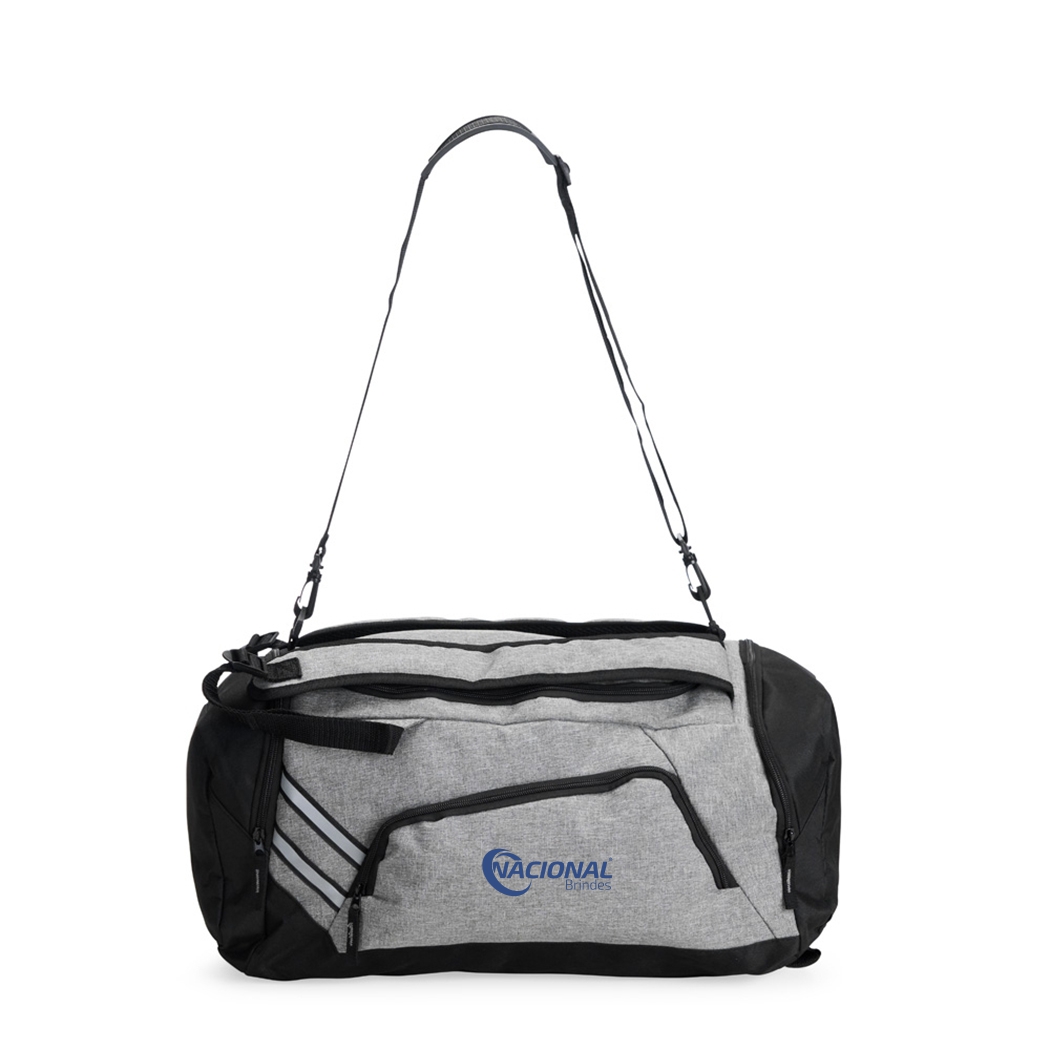 Mala de viagem em poliéster. Possui resistência a água, alças ajustáveis e acolchoada para as costas, pois pode ser usada como mochila. Conta com um compartimento principal na parte interna, três bolsos externos, sendo um deles exclusivo para tênis e alça transversal removível.
