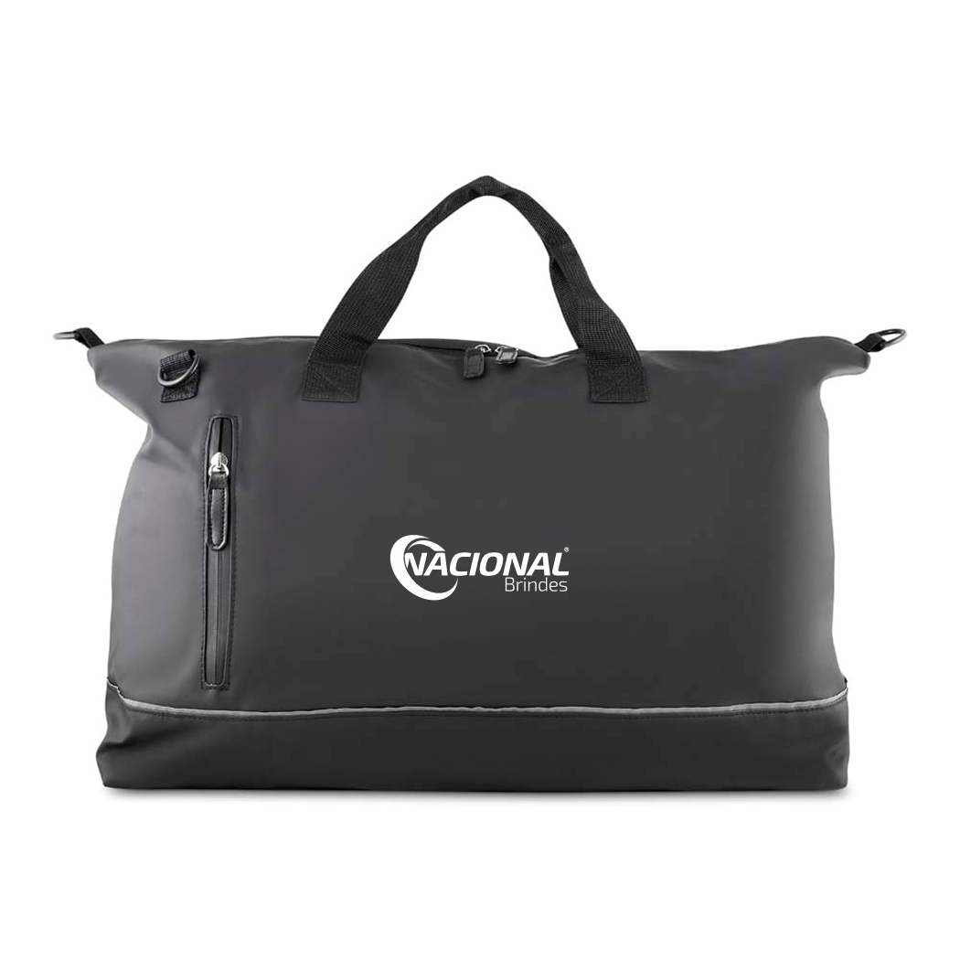 Mala esportiva com faixa refletiva. Fabricada em PU e revestimento interno em poliéster 210D. Possui bolso frontal com zíper, dois compartimentos internos, alça de mão e alça de ombro ajustável.