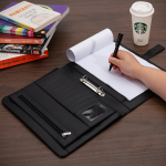 Pasta com fecho, bloco de notas e bolso de ziper na parte interna, compartimento para cartões e fecho imaltado com plaquinha personalizável.